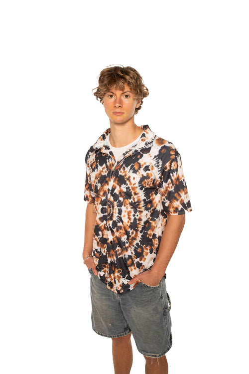 Elevate your casual style with this men’s tie-dye button-up shirt, featuring an eye-catching swirl pattern in earthy tones of black, white, and burnt orange. Perfect for summer outings, beach days, or casual gatherings, this short-sleeve shirt brings a retro-inspired vibe with a modern twist. Made from lightweight, breathable fabric, it offers comfort and style, ideal for warm weather. The unique color combination and bold design make it a statement piece for anyone looking to add a touch of personality to their wardrobe. This trendy tie-dye shirt pairs well with jeans, shorts, or chinos for an effortlessly cool look.